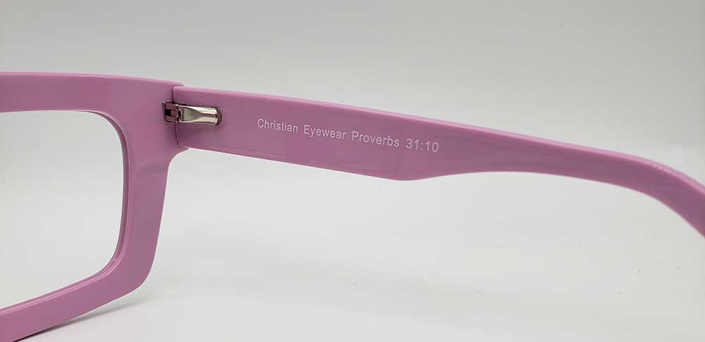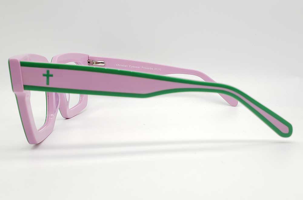 The Proverbs 31:10 Pink And Green glasses are beautifully colored frames with a green cross on each temple. These frames feature durable spring hinges.