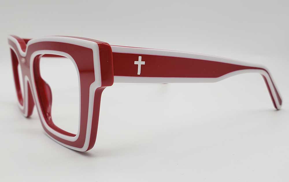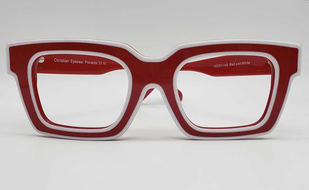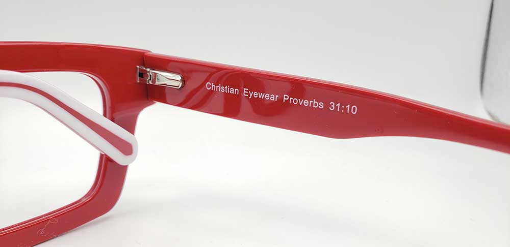 The Proverbs 31:10 Red And White glasses are beautifully colored frames with a white cross on each temple. These frames feature durable spring hinges.